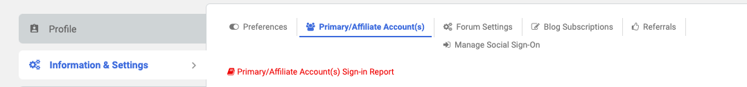 - Under the "Information & Settings" section, click "Primary/Affiliate Account(s)". Here, you may view and manage your Primary/Affiliate account(s).