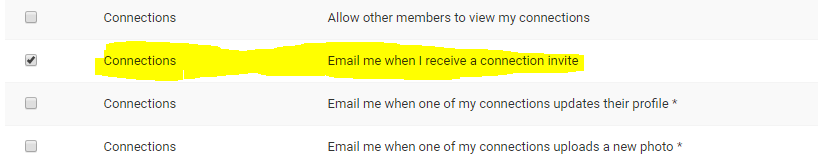 - Under the Category “Connections” select or toggle on “Email me when I receive a connection invite”